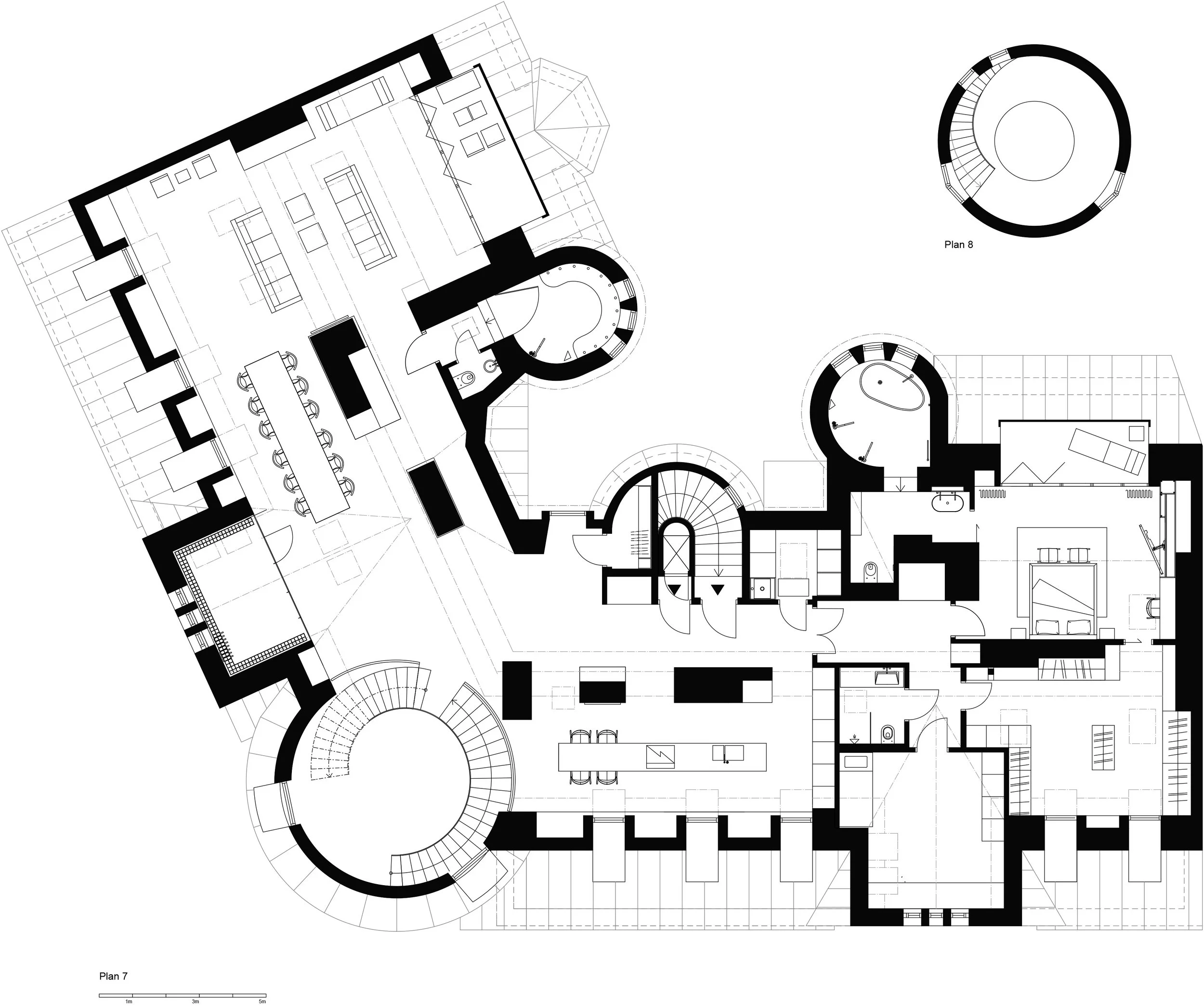 The client wanted an apartment that was full of surprising moments. It was done as a set of individual events. A luxury tool-box. Every different type of space was treated to have its unique features. One of the main features is the big spectacular stair that ties the floors together as a central core. Another spectacular thing is the apartments seven bathrooms, all done in different stones.
